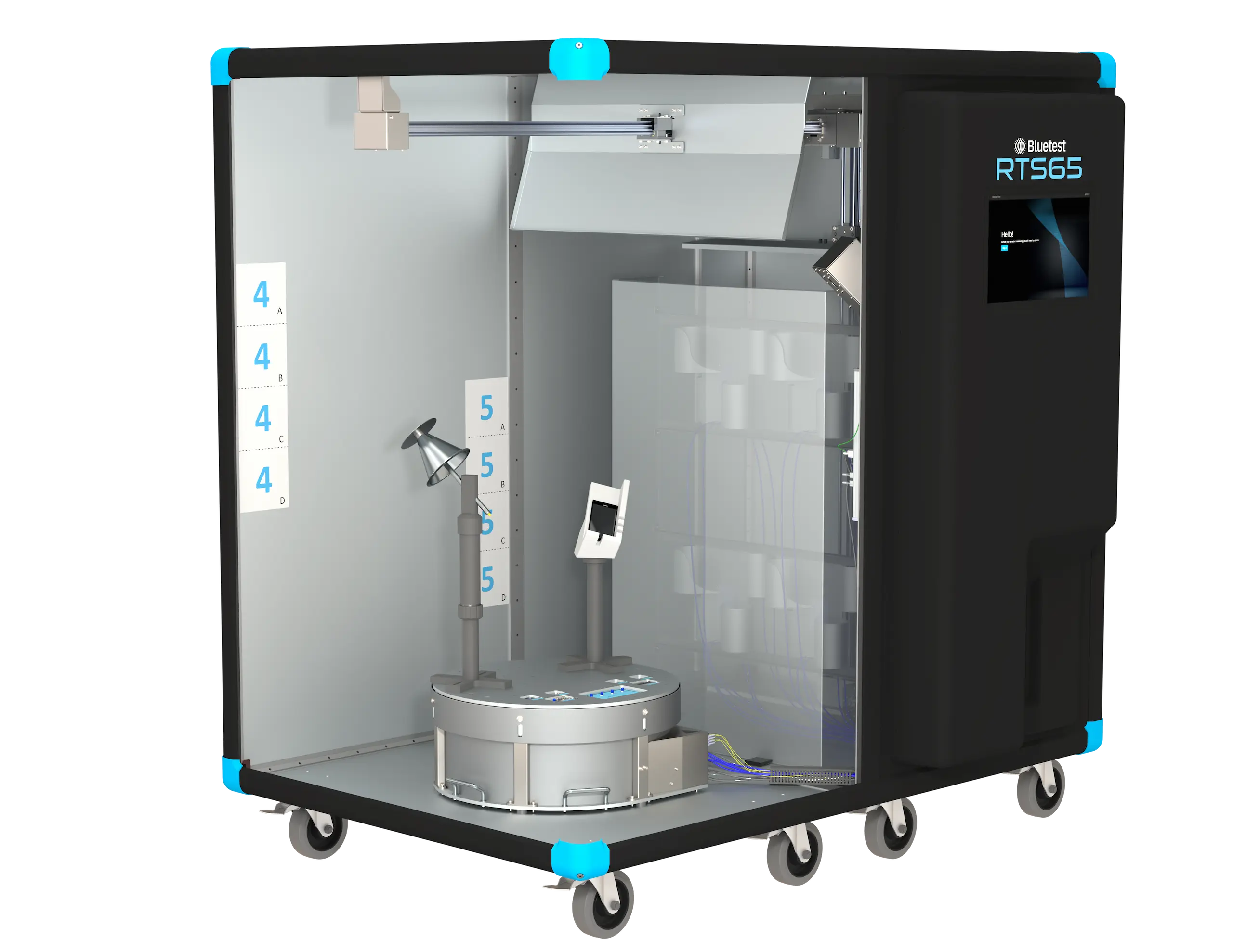 RTS65 creates a Rayleigh faded rich isotropic multipath environment (“RIMP”) using reflecting walls, a DUT turntable, and moving reflectors (mode stirrers). Multipath is enabled by default, and transitioning from SISO to realistic MIMO evaluation typically requires only a few more cables and a MIMO-enabled communication tester. This environment is well-suited for modern multi-antenna devices such as WLAN, 4G and 5G, supporting both productivity and measurement robustness.