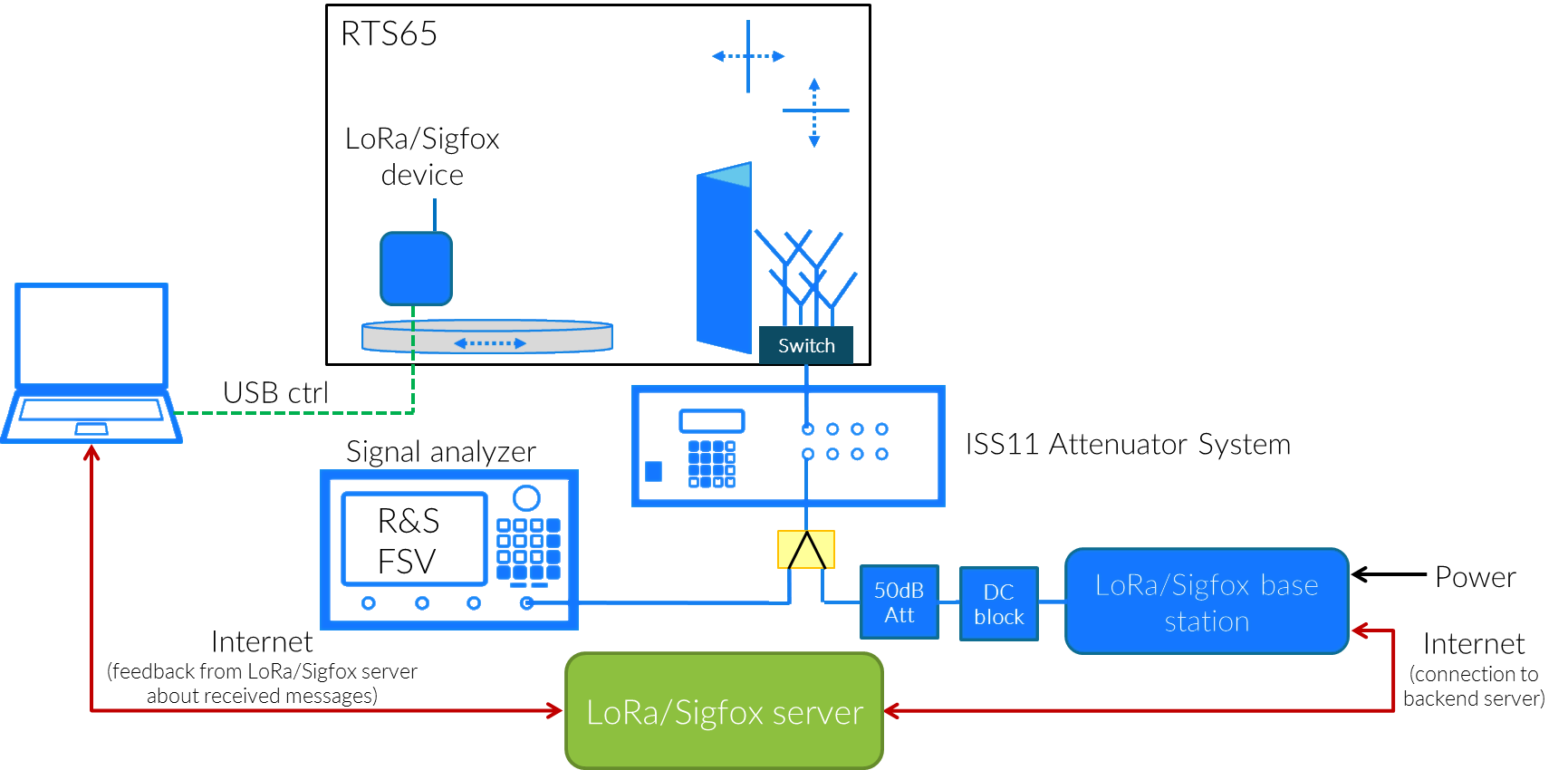 Bluetest’s proposed test setup using the world leading RTS65 OTA (over-the-air) reverberation chamber with the integrated software platform Flow, and the programmable ISS11 Attenuator, a step attenuator to control the path loss between the base station and the device. The measurement solution uses real Sigfox and LoRa base stations connected to their respective back-end servers, providing direct feedback about the number of received messages from the IoT devices and the signal quality of these received messages.
