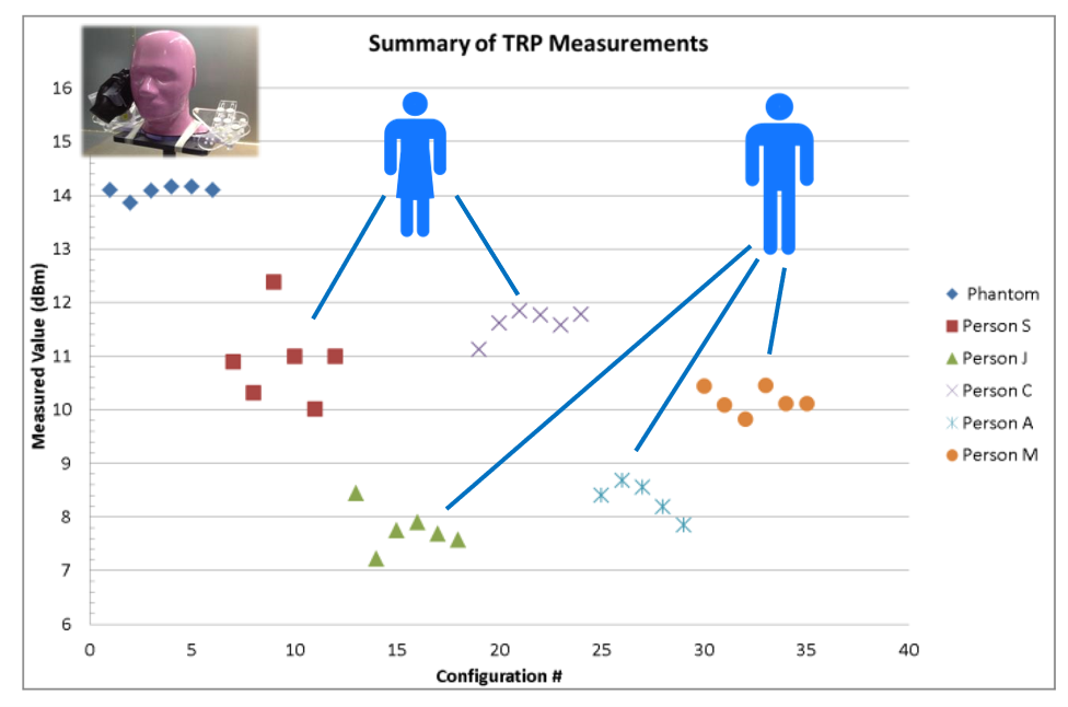 The figure above shows TRP (Total Radiated Power) measurements on a mobile phone in “call mode” with a head/hand phantom and five different persons. The measurement was repeated 6 times for each person. Person 1 repositioned the phone between each measurement while the measurements for person 2-5 were run back-to-back, with the test person holding the phone the same way for all 6 measurements. The variation is as expected larger for the humans than for the phantom, but the measurements are still very repetitive and with a clear person-to-person difference. The difference is in this case well correlated with the size of the person.